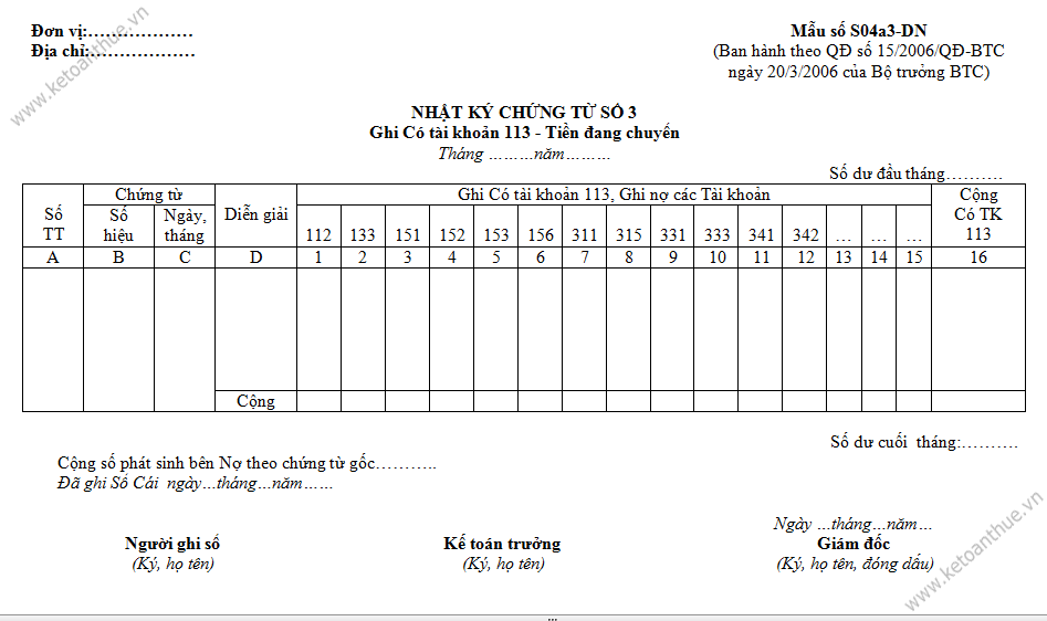Mẫu số S04a3-DN: Nhật ký Chứng từ số 3 : Ghi Có tài khoản 113 - Tiền đang chuyển
